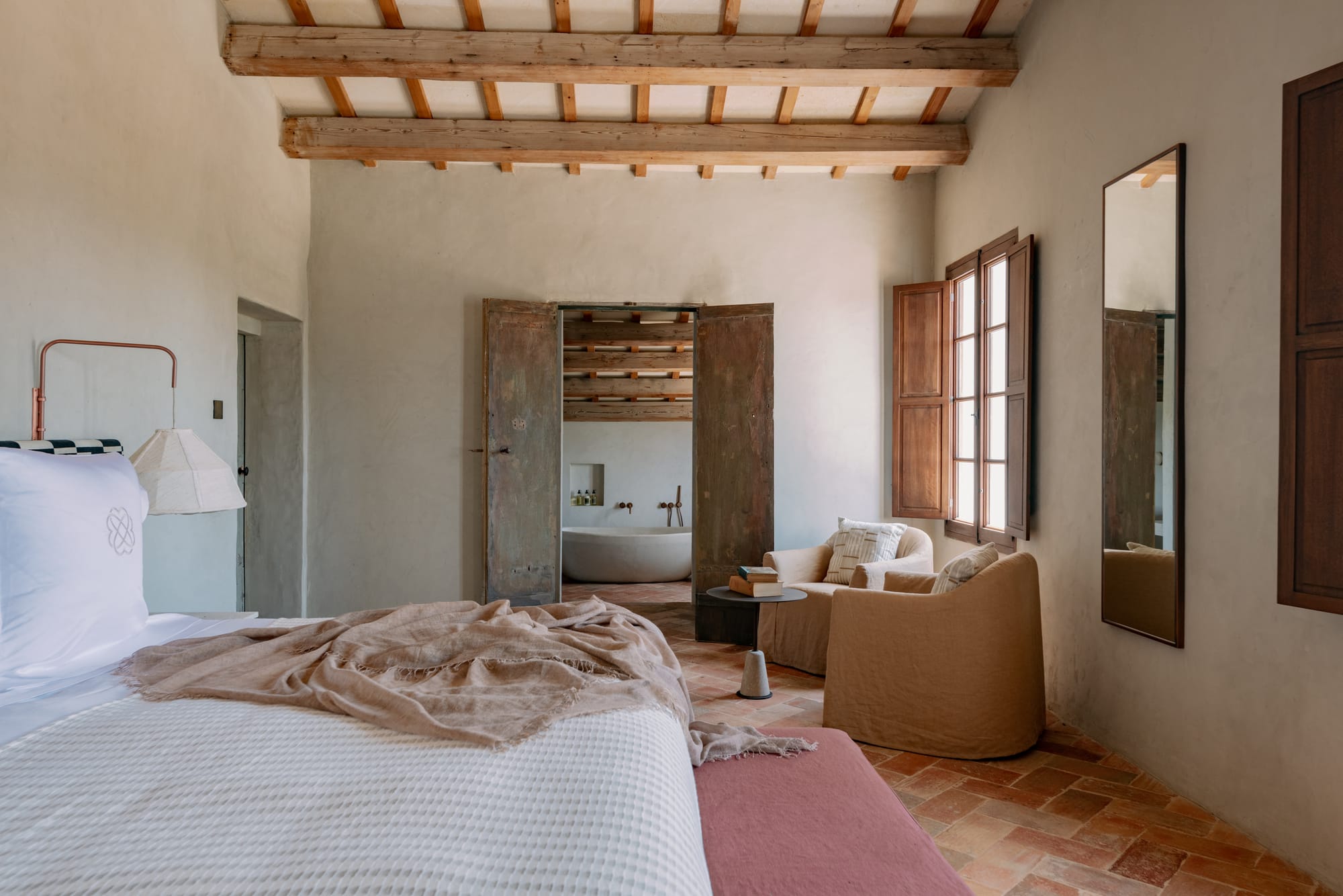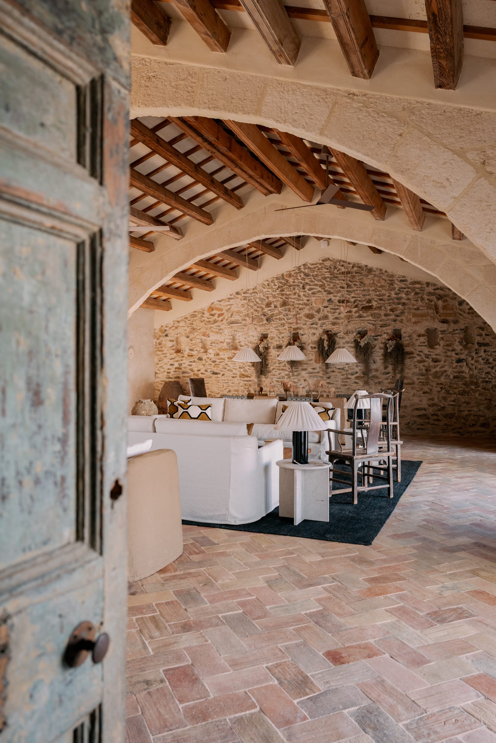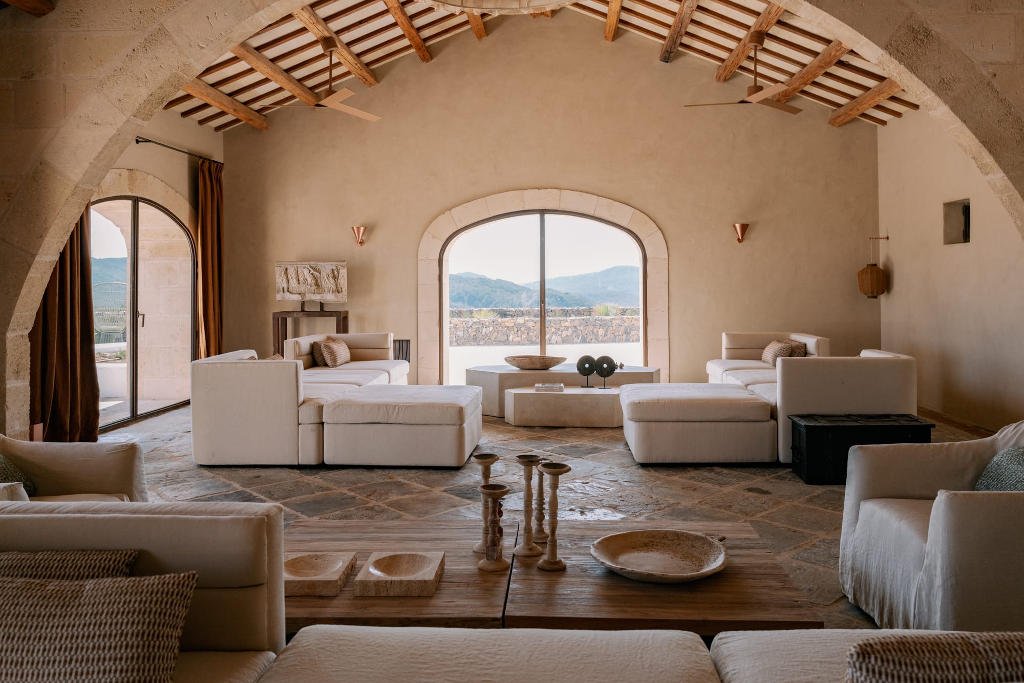 The design language uses Menorca as the material brief. Son Ermità is pale, elevated, and coastal-facing. Binidufà is warmer, red-toned, and valley-set. Interiors mix antique furniture from the family collection with bespoke pieces made by local craftspeople, while stone, wood, lime plaster, restored outbuildings, terraces, pools, and garden views keep the setting visible. The design communicates quiet wealth through texture, space, and age rather than decoration.
