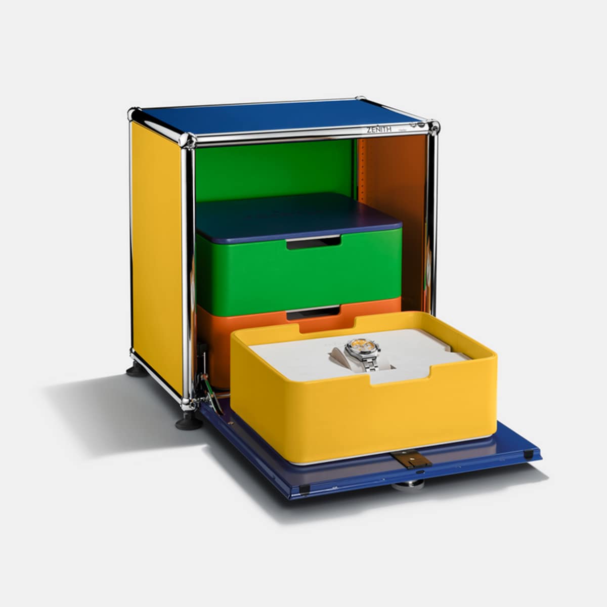 The play is colorways and design fluency. By importing USM’s furniture palette onto the dial, Zenith shifts the Defy from pure horology into the language of design. These aren’t just watches, they’re swatches, wearable extensions of a modernist color system. That lets Zenith talk to two audiences at once: collectors who respect the El Primero movement, and creatives who read color as cultural fluency.