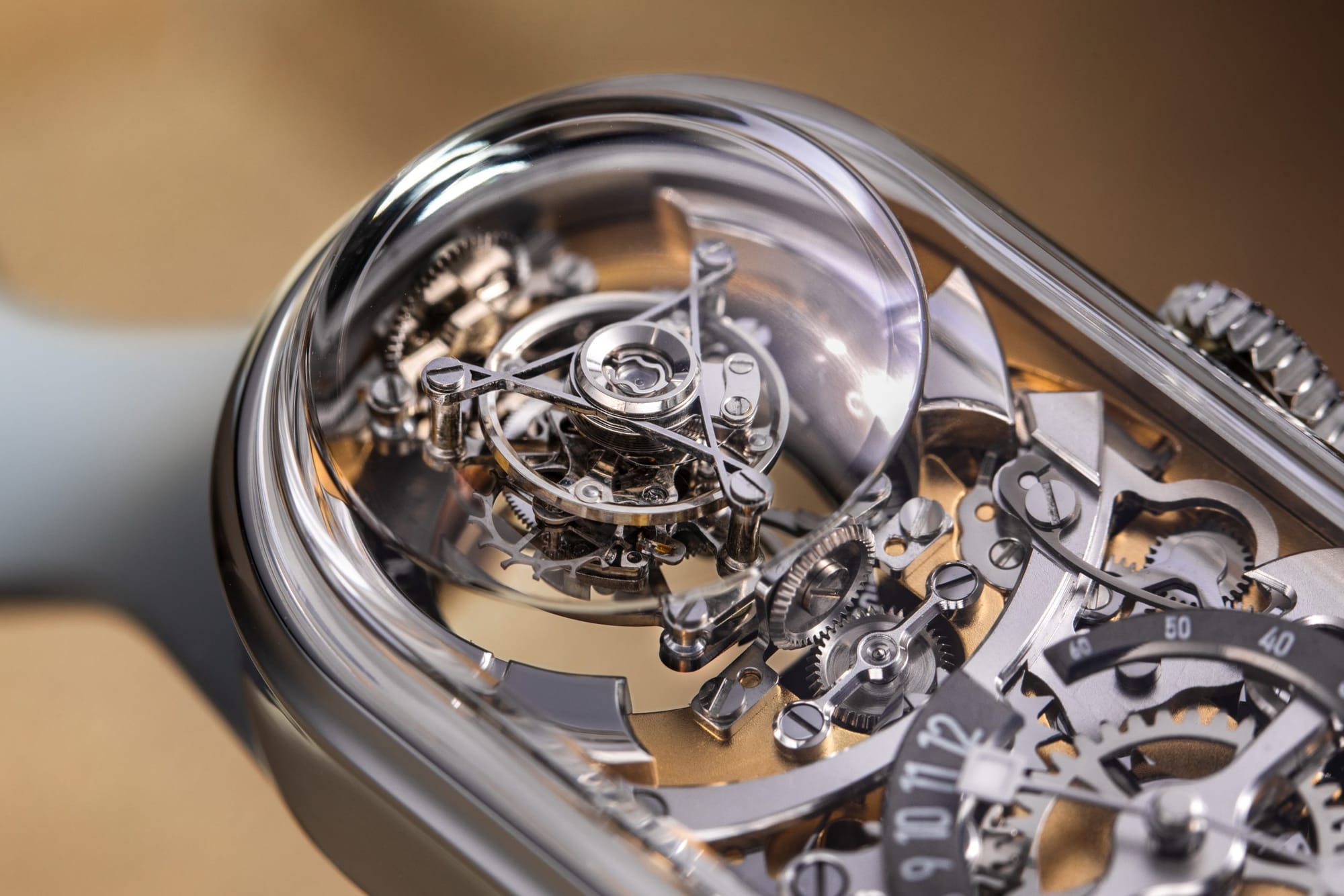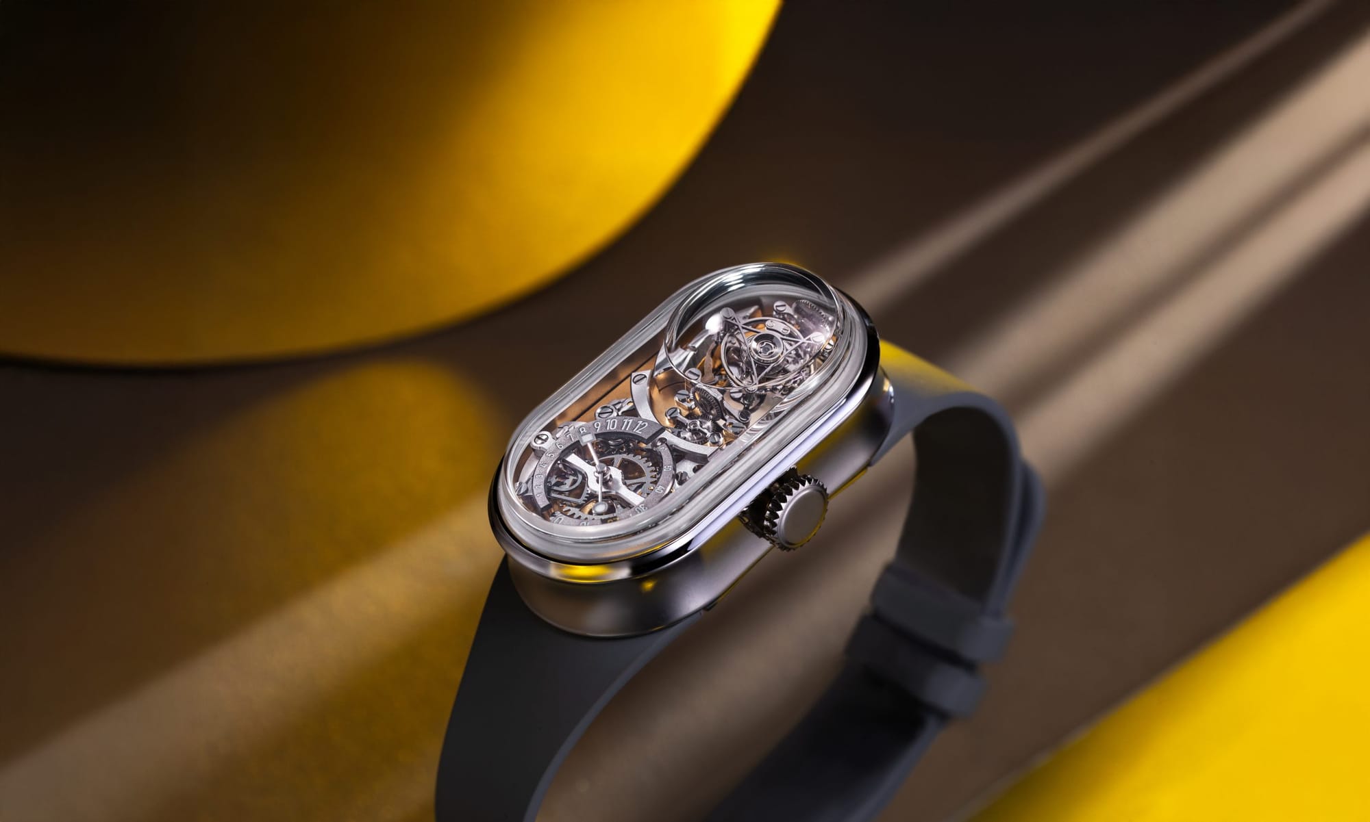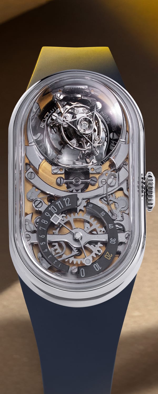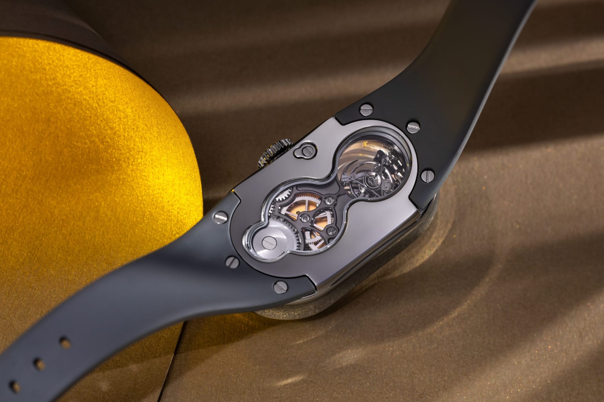 The Nebula uses a capsule silhouette, domed sapphire, frosted gold plates, and Möbius-geometry mechanics to communicate a futuristic craft ethos. It mixes sculpture, astronomy, and micro-horology into a visual language that feels more like kinetic art than watch design.