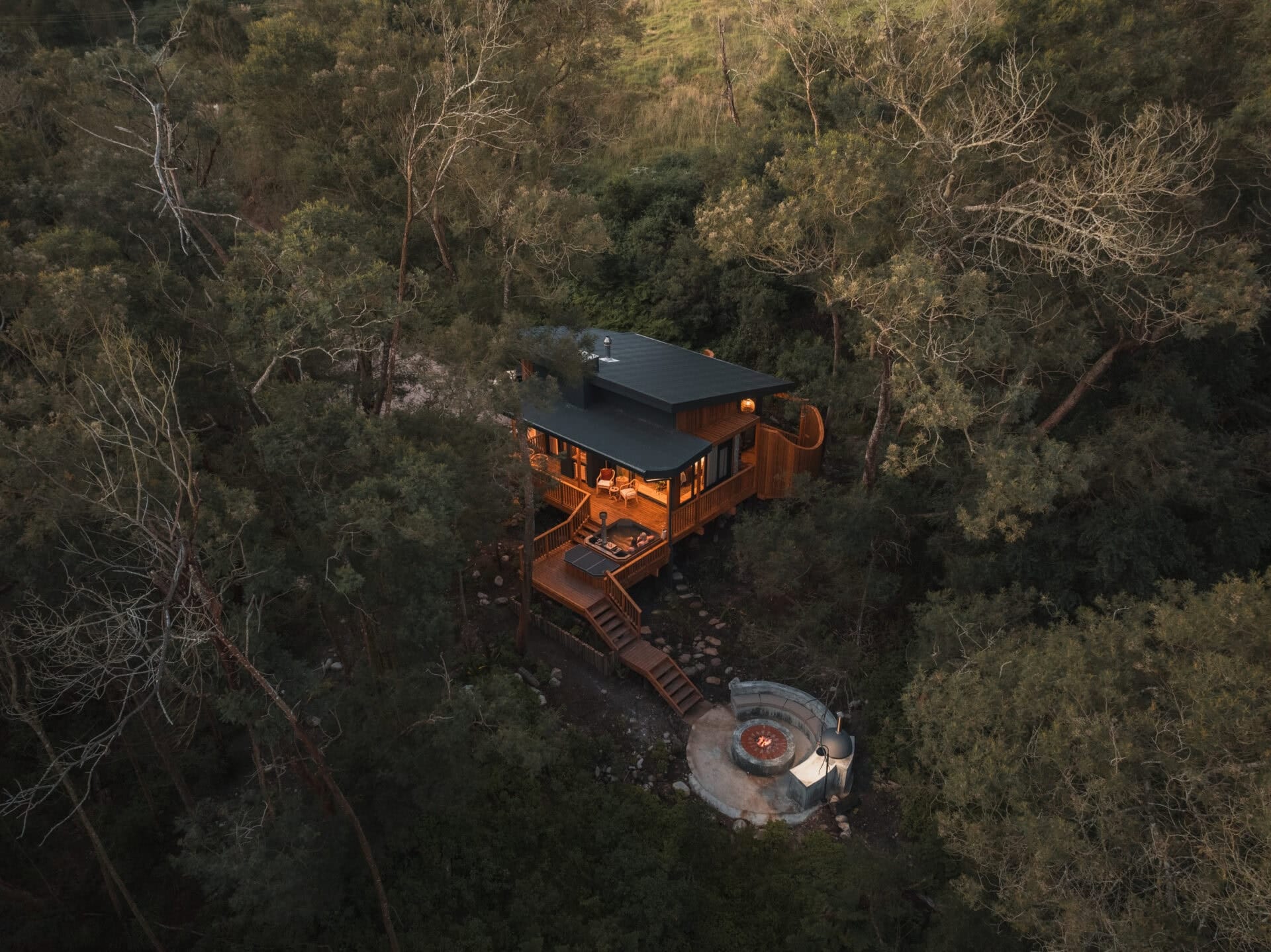 Boomhuis Cabin sits deep in an indigenous forest at the base of the Outeniqua Mountains along South Africa’s Garden Route. It’s a one-bedroom retreat designed for two, wrapped in trees, light, and quiet. Inside, the space is compact but considered: a fireplace dividing living and sleeping areas, red velvet dining chairs, and a kitchenette stocked with small comforts like farm-fresh eggs and homemade piquante peppers. Outside, the experience opens up. A wood-fired hot tub, fire pit, pizza oven, braai, and double outdoor shower turn the clearing around the cabin into a series of places to linger. Town is close enough to reach easily, but far enough to forget.