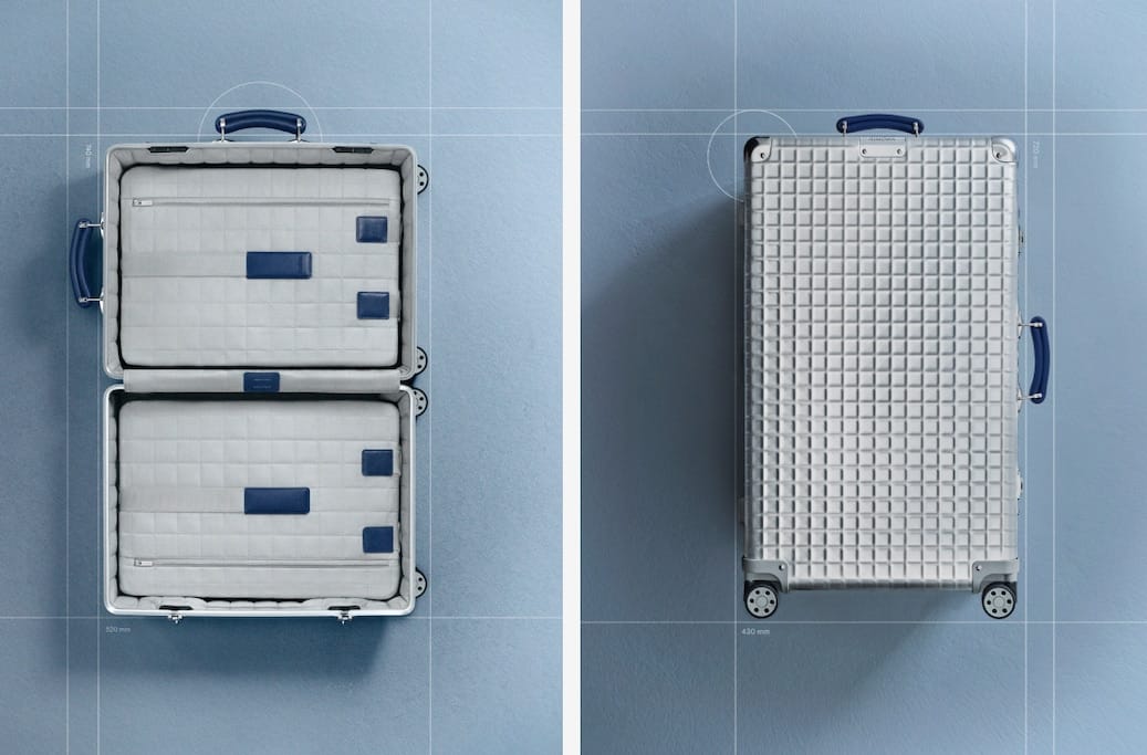 The Classic Aluminum Grid Collection’s design language is rooted in RIMOWA’s legacy of precision and innovation. The embossed grid pattern creates a striking visual and tactile contrast with the brand’s traditional grooved aluminum, while the heritage blue leather and palladium hardware add a touch of luxury. The quilted interior lining, featuring a matching grid motif, extends the design theme throughout the piece. Packaging and promotional materials highlight the collection’s archival inspiration, German craftsmanship, and limited-edition exclusivity, using clean imagery and a focus on the geometric pattern to communicate its unique appeal.