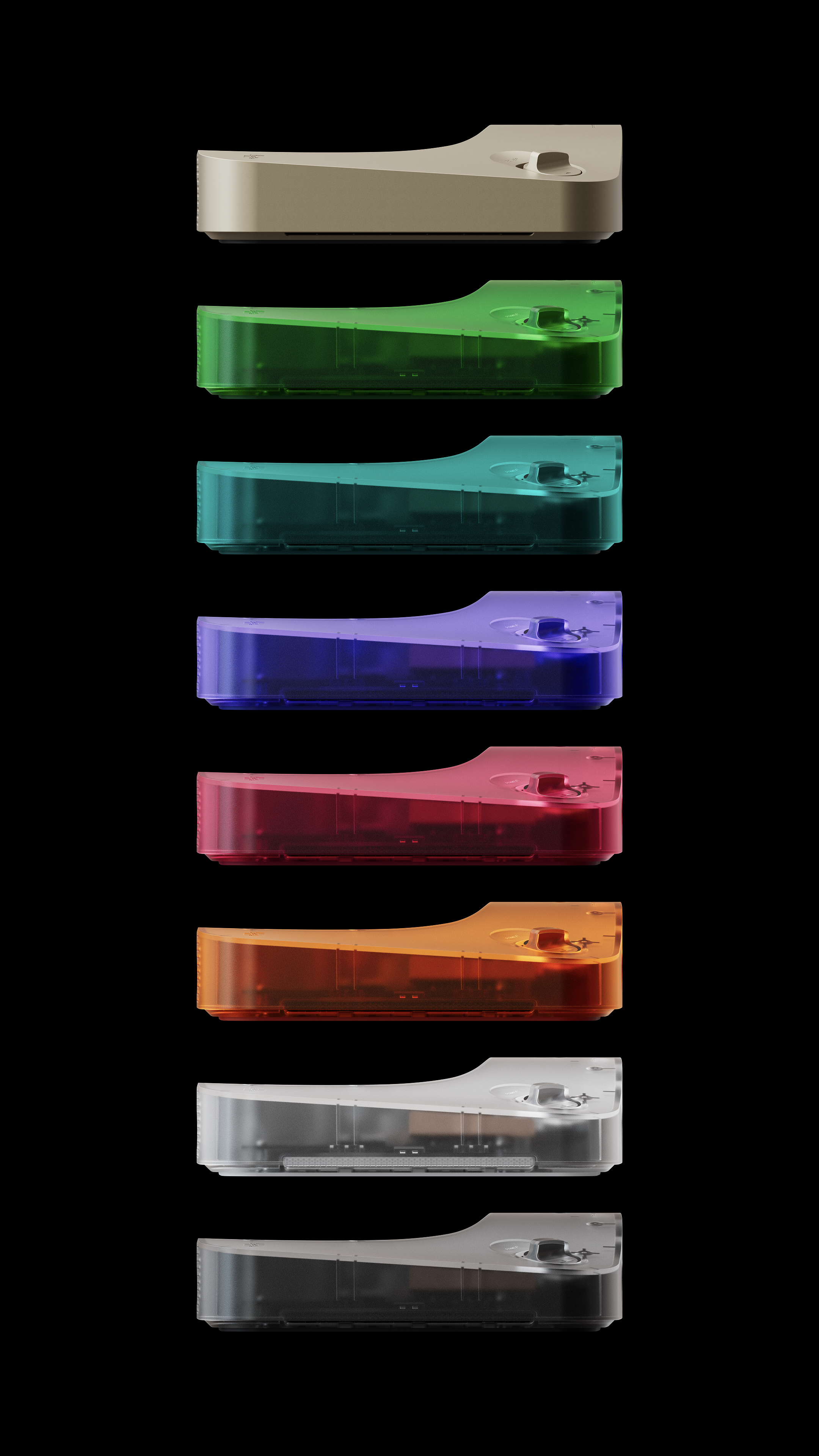 The design language is pure “retrofuturist transparency.” Clear shells, jewel-toned plastics, precise machining, and typography reminiscent of both Apple industrial design and 90s toy culture. Packaging and colorways do the semiotic work: this is luxury disguised as childhood. The translucency is not decoration. It is a certificate of authenticity in visual form.