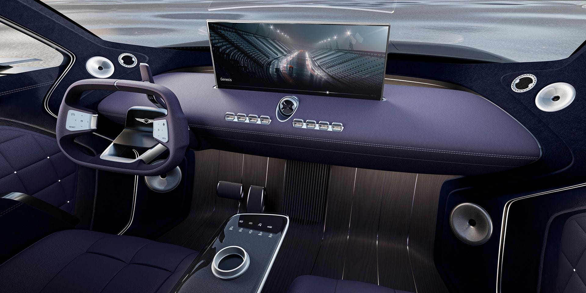 Genesis separates the Neolun Concept through its reductive design approach, removing excess to highlight form and detail. The seamless exterior and two-line lighting create a distinct visual identity. Inside, advanced technology such as the crystal sphere speaker sits alongside traditional materials and references. The result is a vehicle that pairs modern engineering with cultural depth.