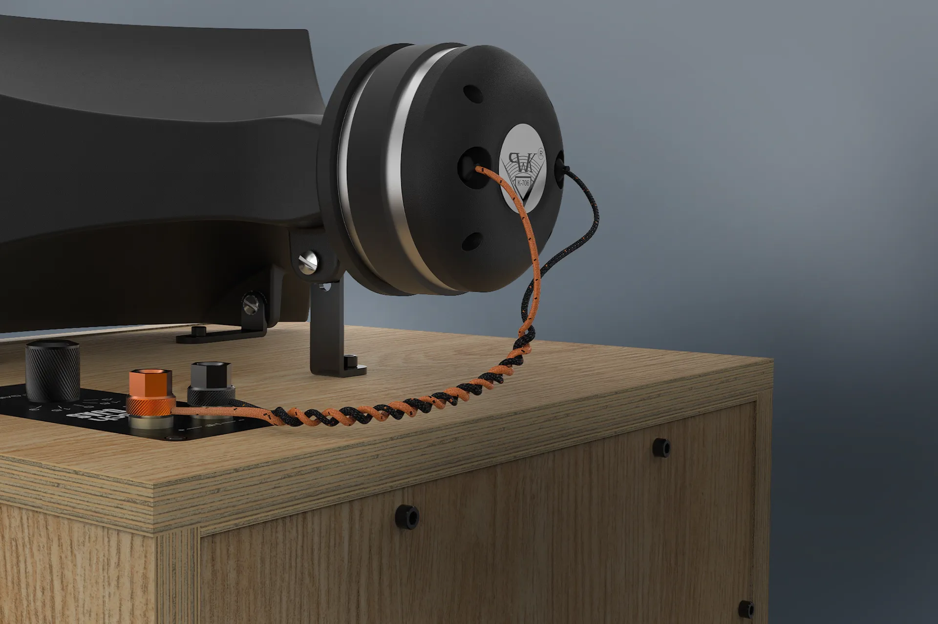 The design language is brutally simple, but not plain. The exposed multicell horn becomes the face of the product. Baltic birch, red oak veneer or pewter gray, matte black horn, visible construction, metal ID plate, and purpose-built stands all make the speaker feel closer to studio equipment, modern furniture, and collectible object design than typical home audio. The package also includes a hardbound book, which turns the ownership experience into something archival. The design tells buyers that the product belongs in a room where the gear can stay visible.