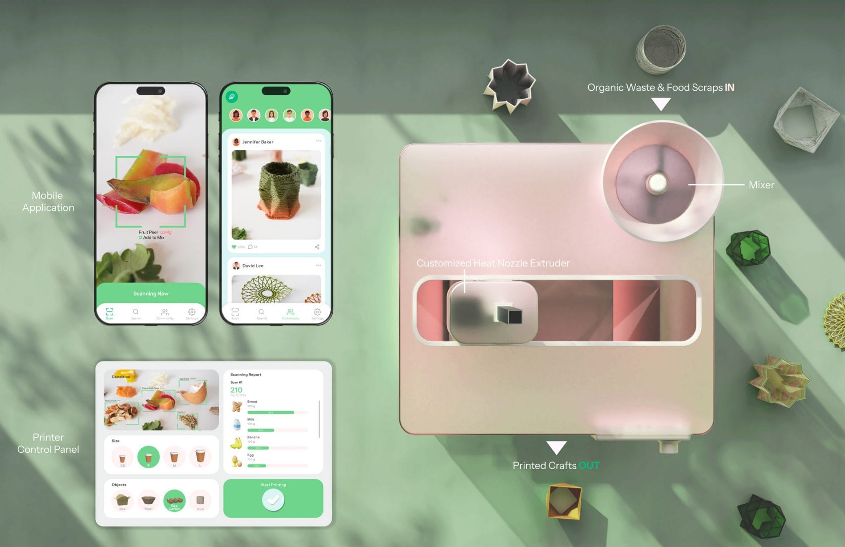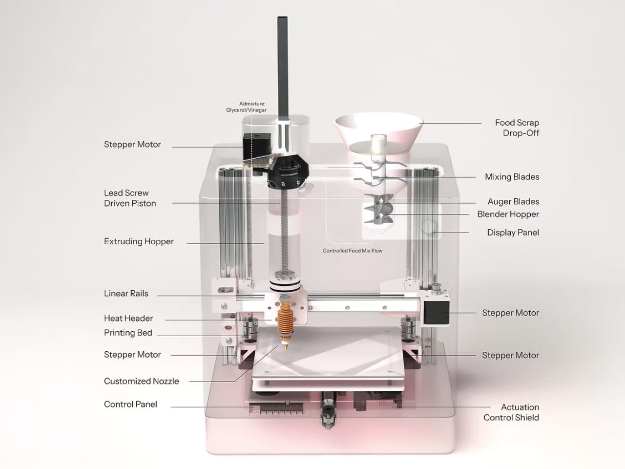 Two MIT students created FOODres.AI, a 3D printer that transforms food waste into household objects. This prototype demonstrates how AI and 3D printing can convert waste into functional and collectible items.